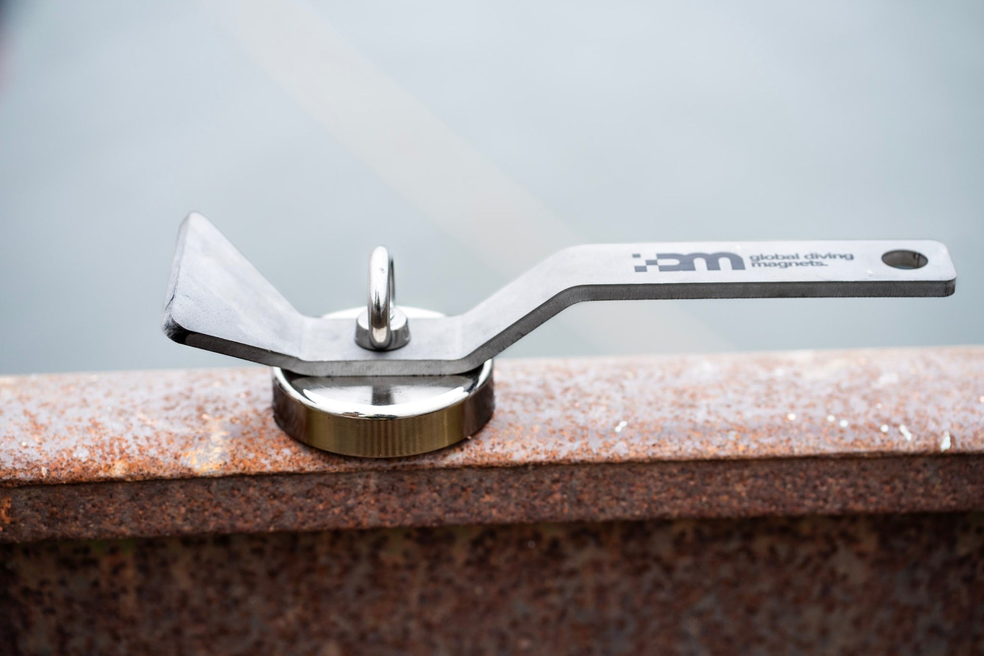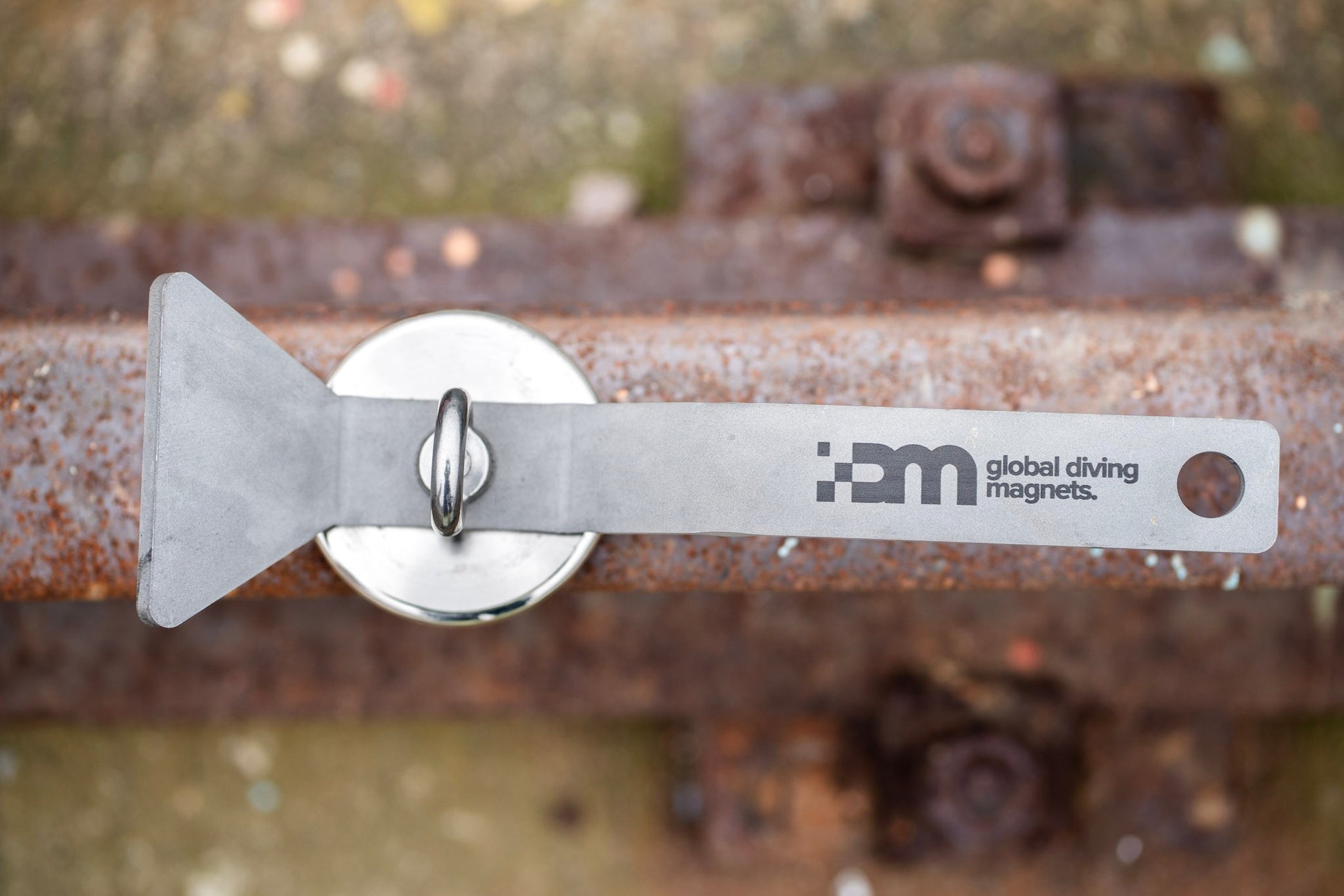This fully assembled diving magnet with handle, scraper, eye-nut and screw, has been carefully designed with the input of commercial divers working in both inshore and offshore environments. The magnet is a Neodymium pot magnet which can support 165kg, with a breaking force of up to 200kg of pull perpendicular to the magnetic face while in direct contact with a mild steel surface of the same thickness.