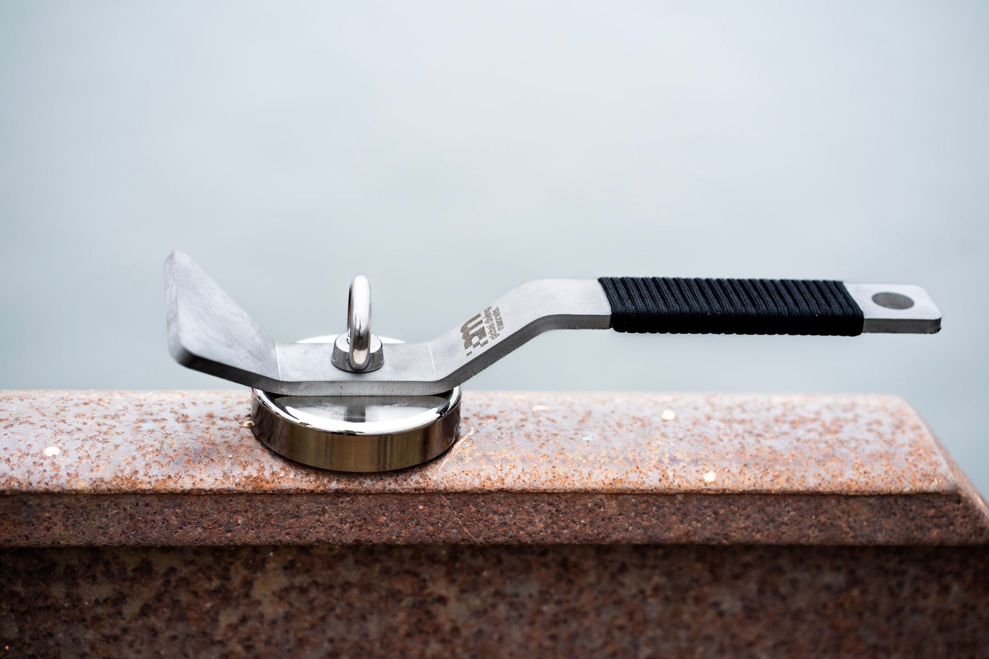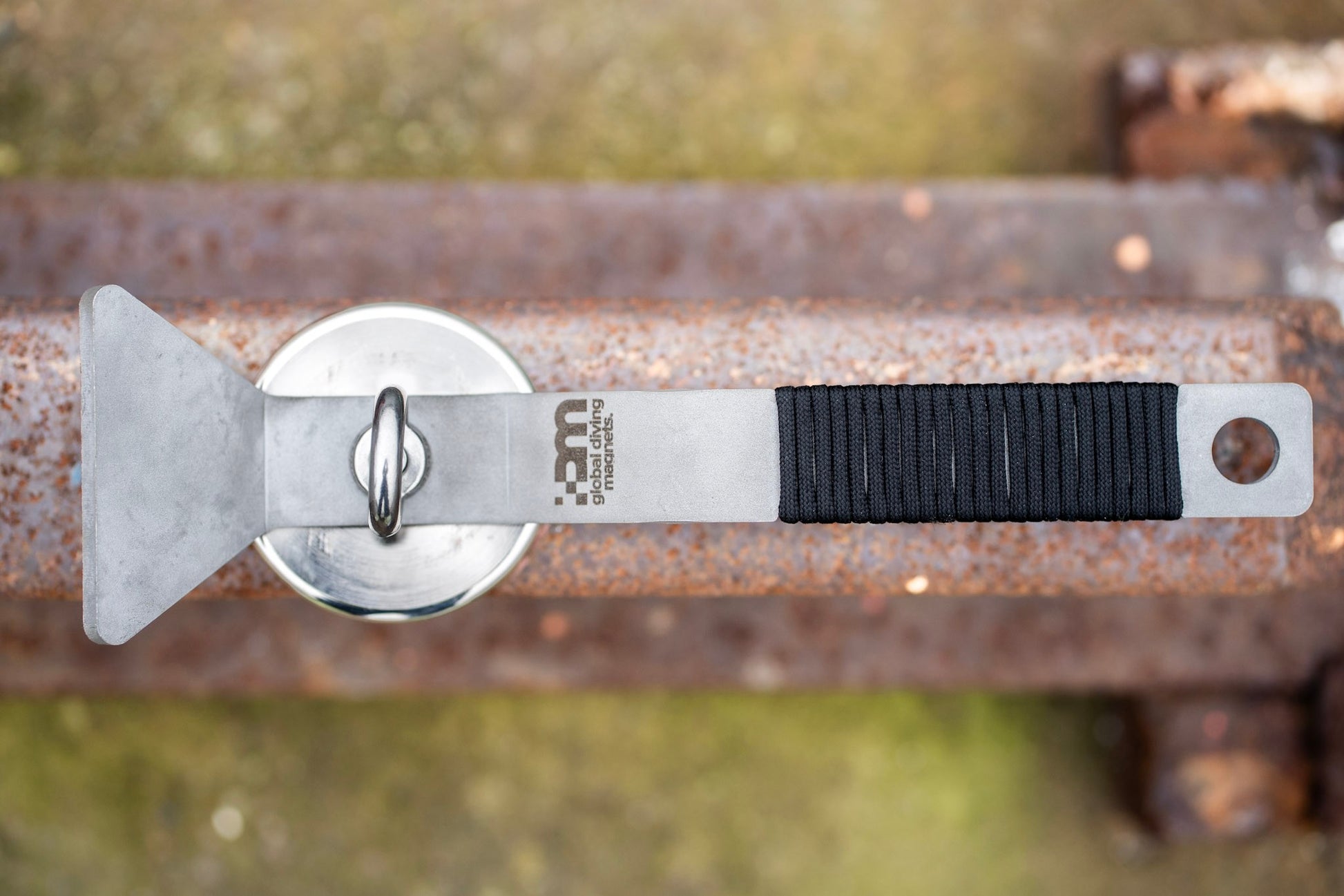This fully assembled diving magnet with handle, scraper, eye-nut and screw, has been carefully designed with the input of commercial divers working in both inshore and offshore environments. The magnet is a Neodymium pot magnet which can support 165kg, with a breaking force of up to 200kg of pull perpendicular to the magnetic face while in direct contact with a mild steel surface of the same thickness. The handle is made from 6mm 316 Stainless Steel, the best marine-graded steel that's available on the market. Handles have been laser cut and CNC folded with rounded edges, this is to ensure the diver's safety when using it, as well as making sure that their suit and equipment stays safe.